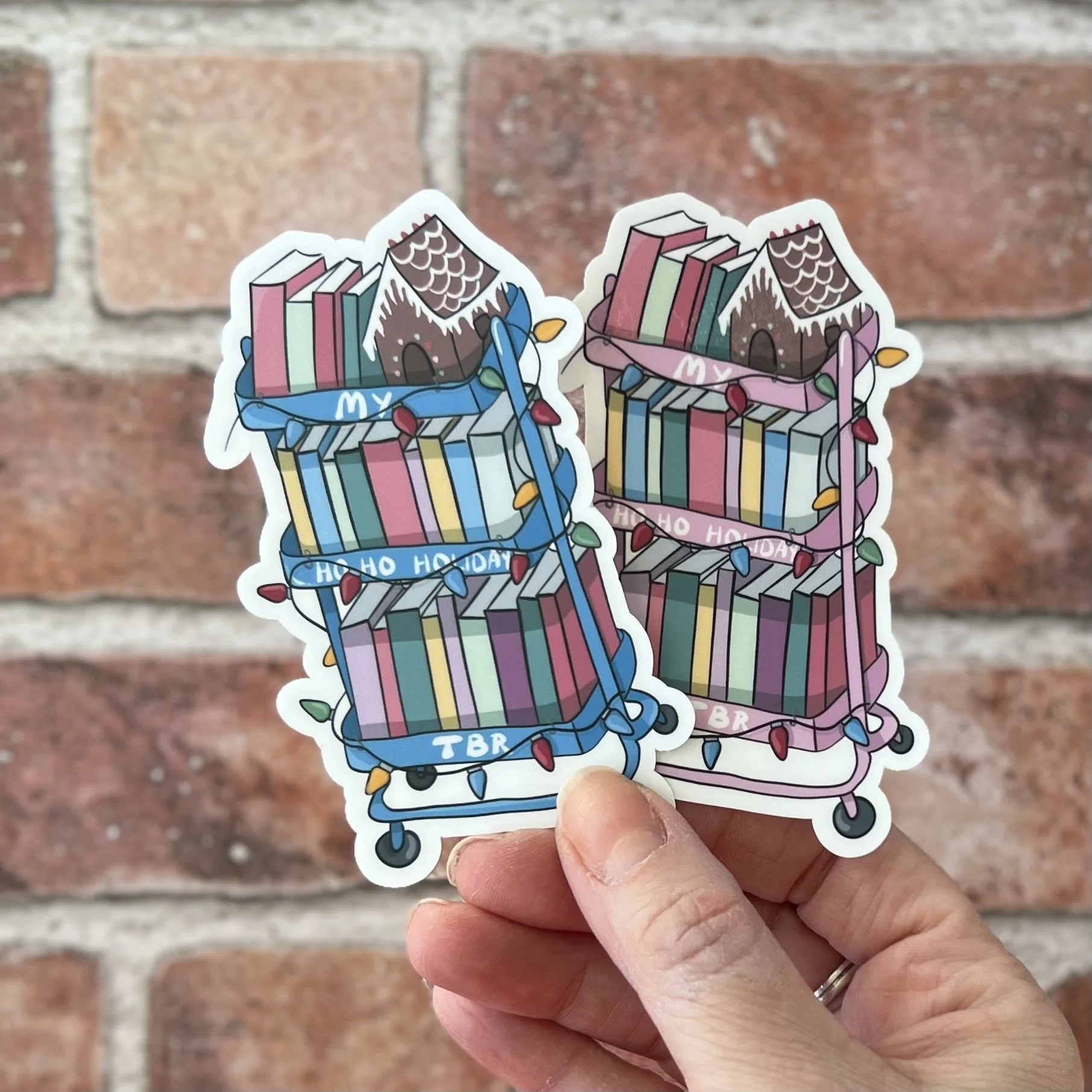 Decorate your water bottle, laptop, or e-reader with this large vinyl decal featuring a holiday TBR cart full of books and a gingerbread house. The TBR cart is adorning a string of colorful Christmas lights and says My HO HO HOliday TBR
